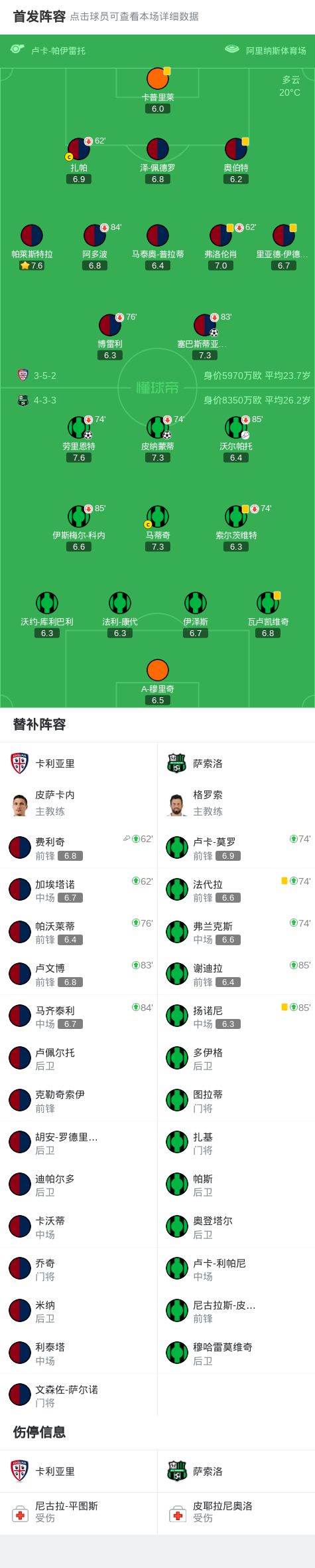萨索洛2-1卡利亚里,皮纳蒙蒂建功,劳里恩特破门